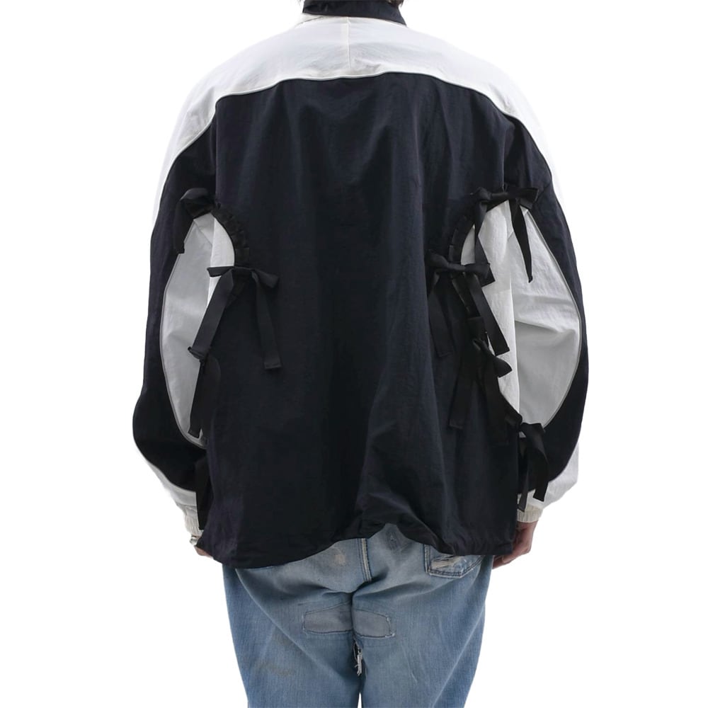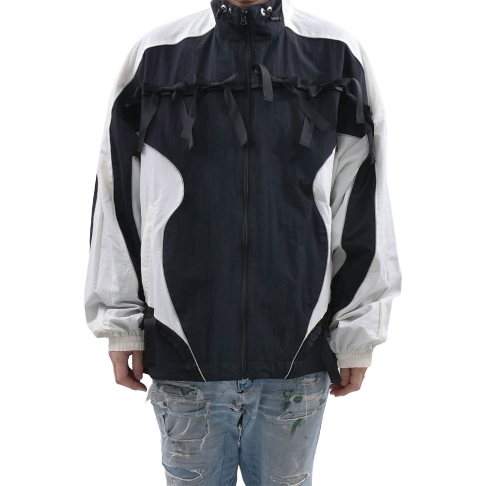 目を引くのは、フロントからバックにかけて贅沢にあしらわれた無数のリボン。スポーティーなトラックジャケットの機能美に、どこかフェティッシュでダークな可愛らしさをプラスしています。モノトーンの流動的なパネル切り替えが、動きのあるシルエットを演出。ブランドが追求する「現代のパンク精神」を体現した一着です。