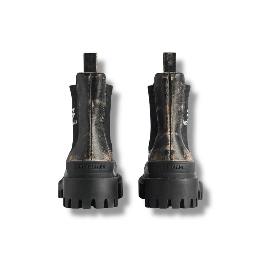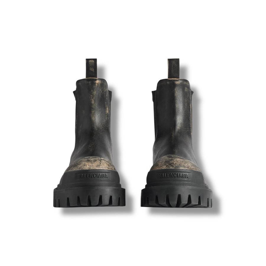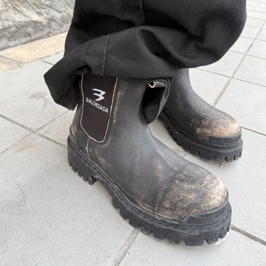 上質なスムースブルスキンに丹念なウォーンアウト(ヴィンテージ)加工を施し、長年履き込んだような奥行きのある表情を再現しました。重厚感のある厚底のラバーソールと、サイドゴア部分に配されたスポーティな「B」ロゴが、クラシックなチェルシーブーツを現代的でエッジの効いた一足へと昇華させています。
