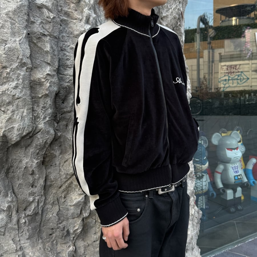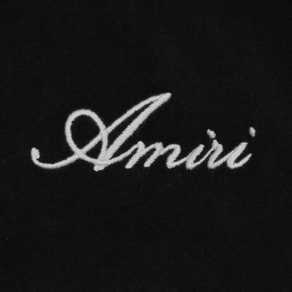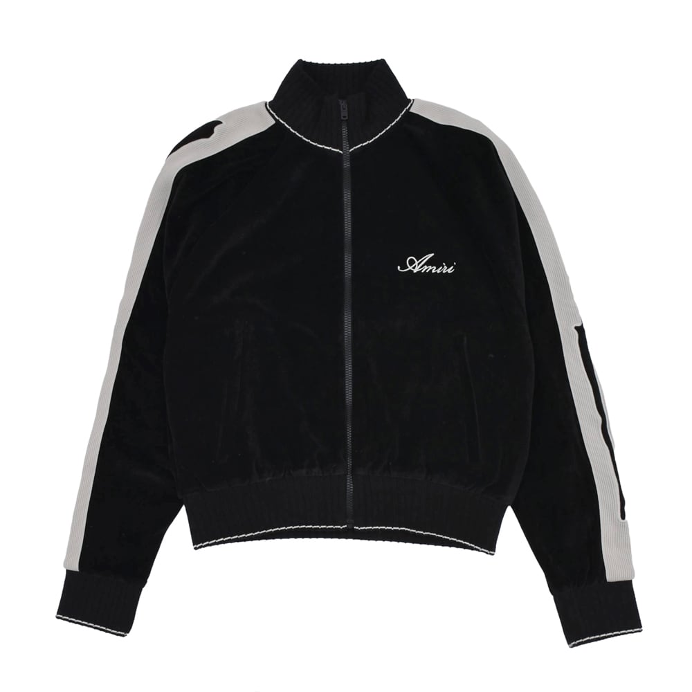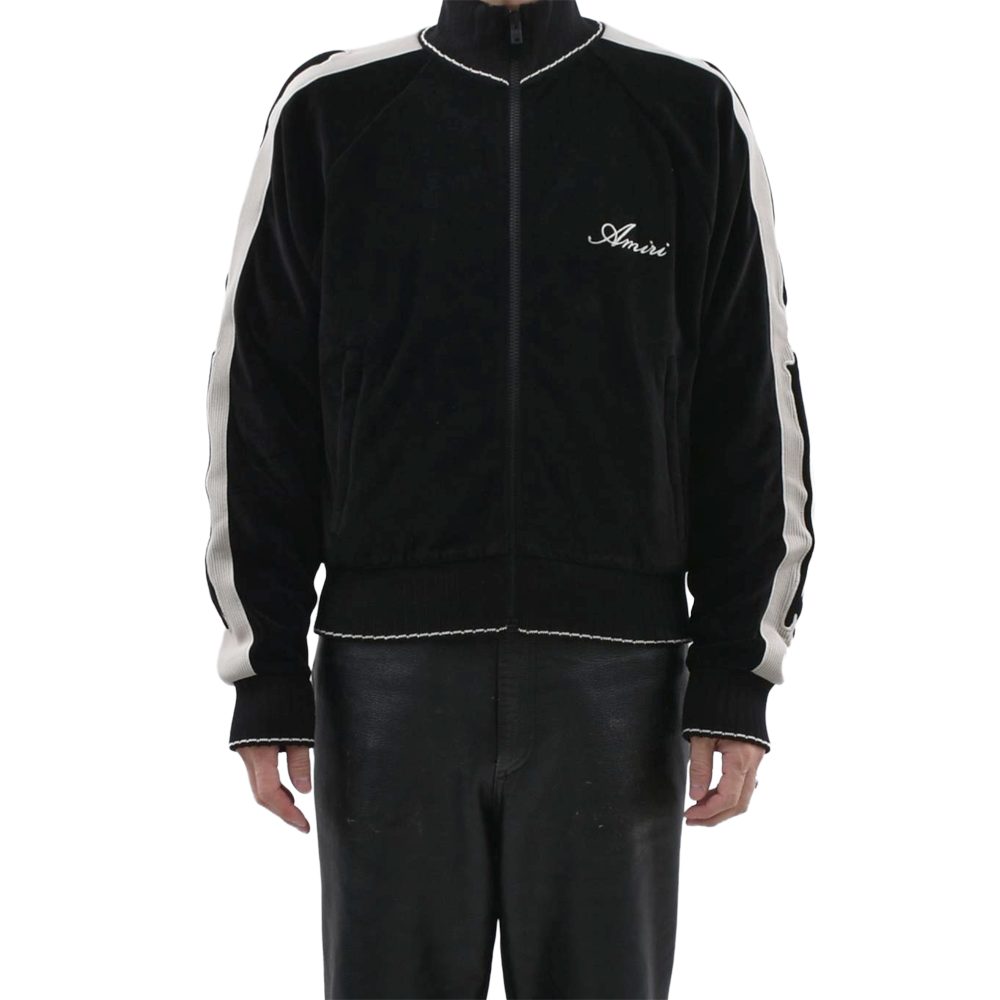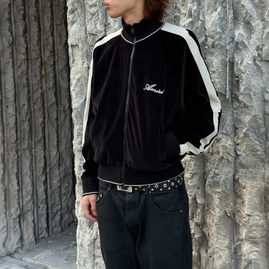 AMIRI's new track jacket is crafted from premium velvet. The glossy black body and contrasting side stripes running from the shoulders to the sleeves elevate the sporty silhouette with elegance. The delicate brand logo embroidery on the chest adds a touch of status. This exquisite piece embodies the essence of "luxury sports," combining the relaxed atmosphere of Los Angeles with a sophisticated, modern feel.