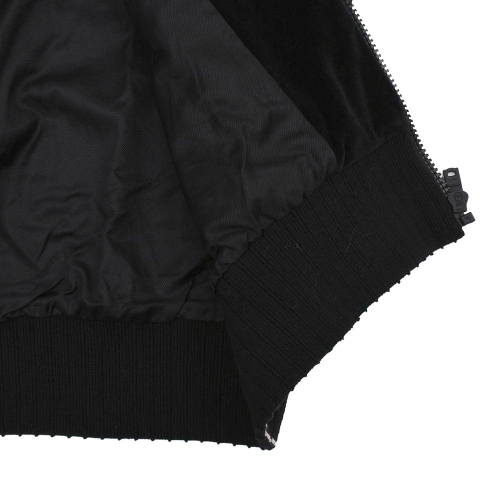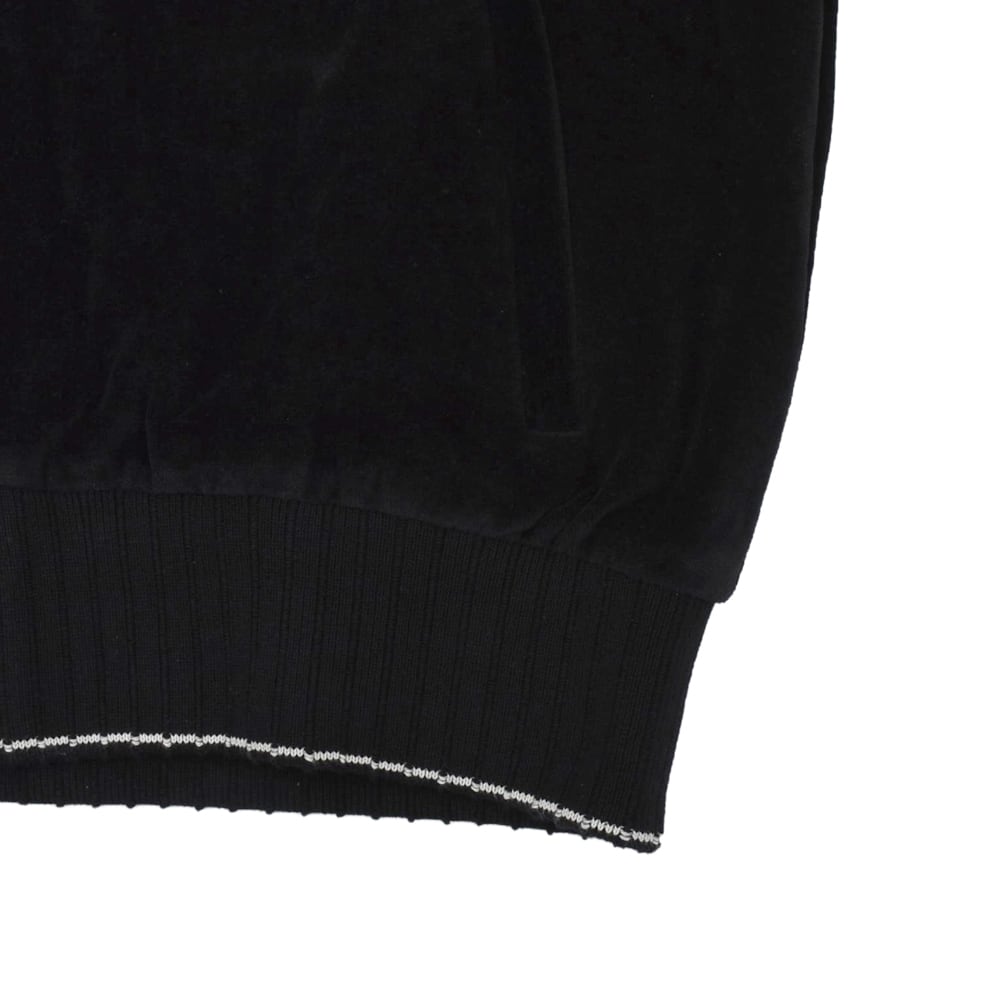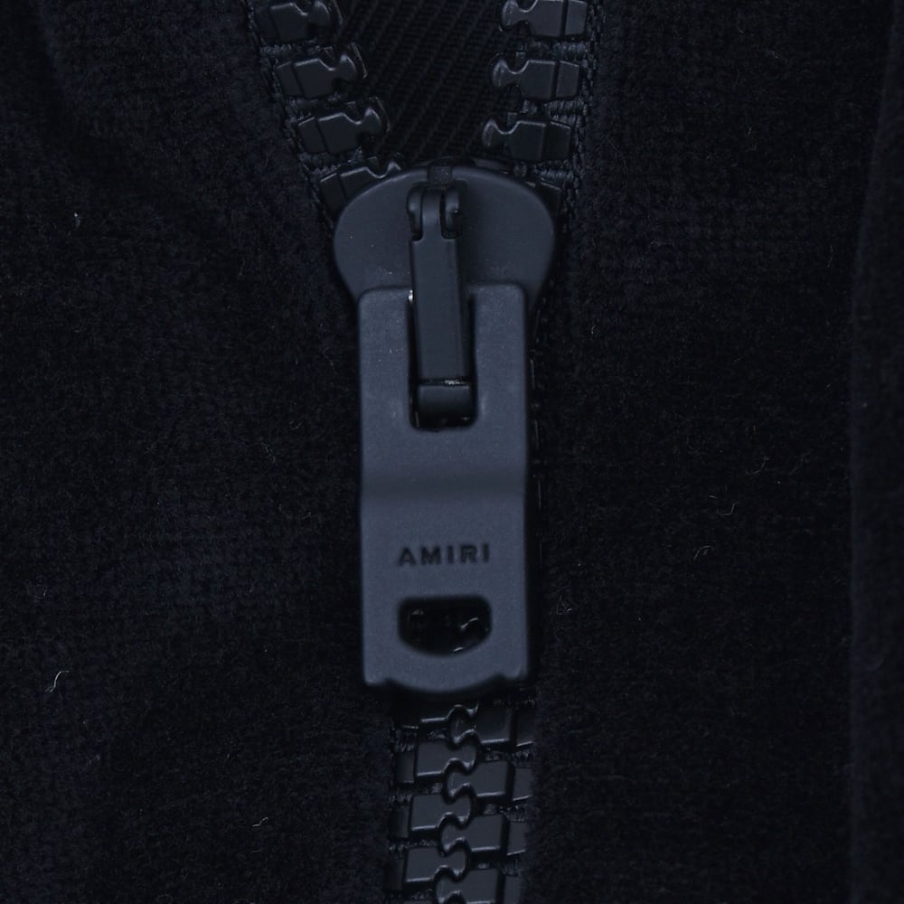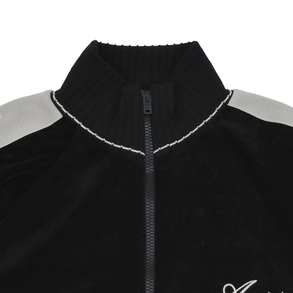 AMIRI's new track jacket is crafted from premium velvet. The glossy black body and contrasting side stripes running from the shoulders to the sleeves elevate the sporty silhouette with elegance. The delicate brand logo embroidery on the chest adds a touch of status. This exquisite piece embodies the essence of "luxury sports," combining the relaxed atmosphere of Los Angeles with a sophisticated, modern feel.