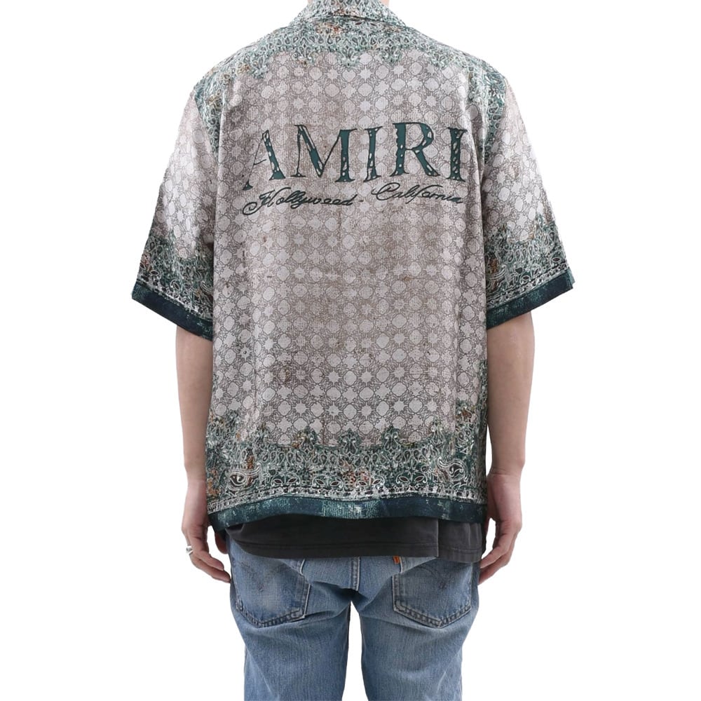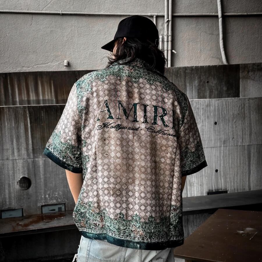 左胸にはさりげなく「AMIRI」のロゴが刺繍されており、ブランドのアイデンティティを主張。オープンカラー(開襟)仕様が首元に抜け感を作り、大人の色気を演出します。