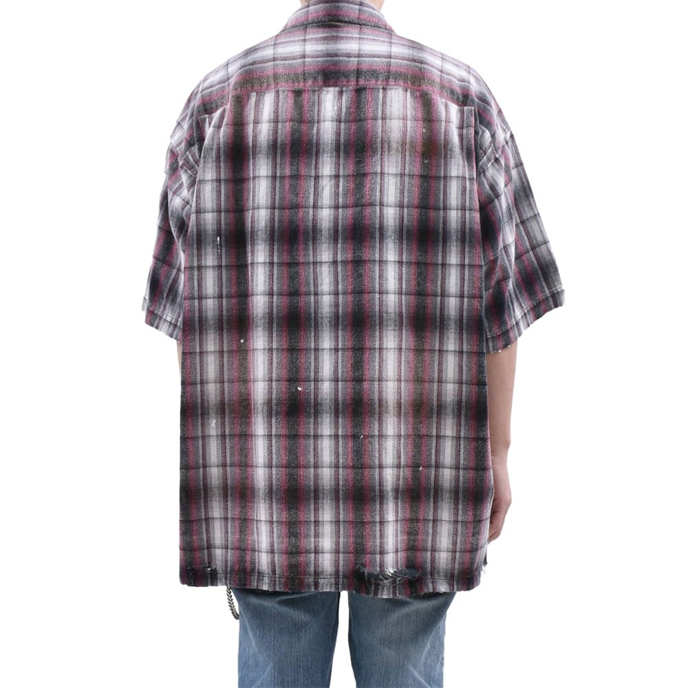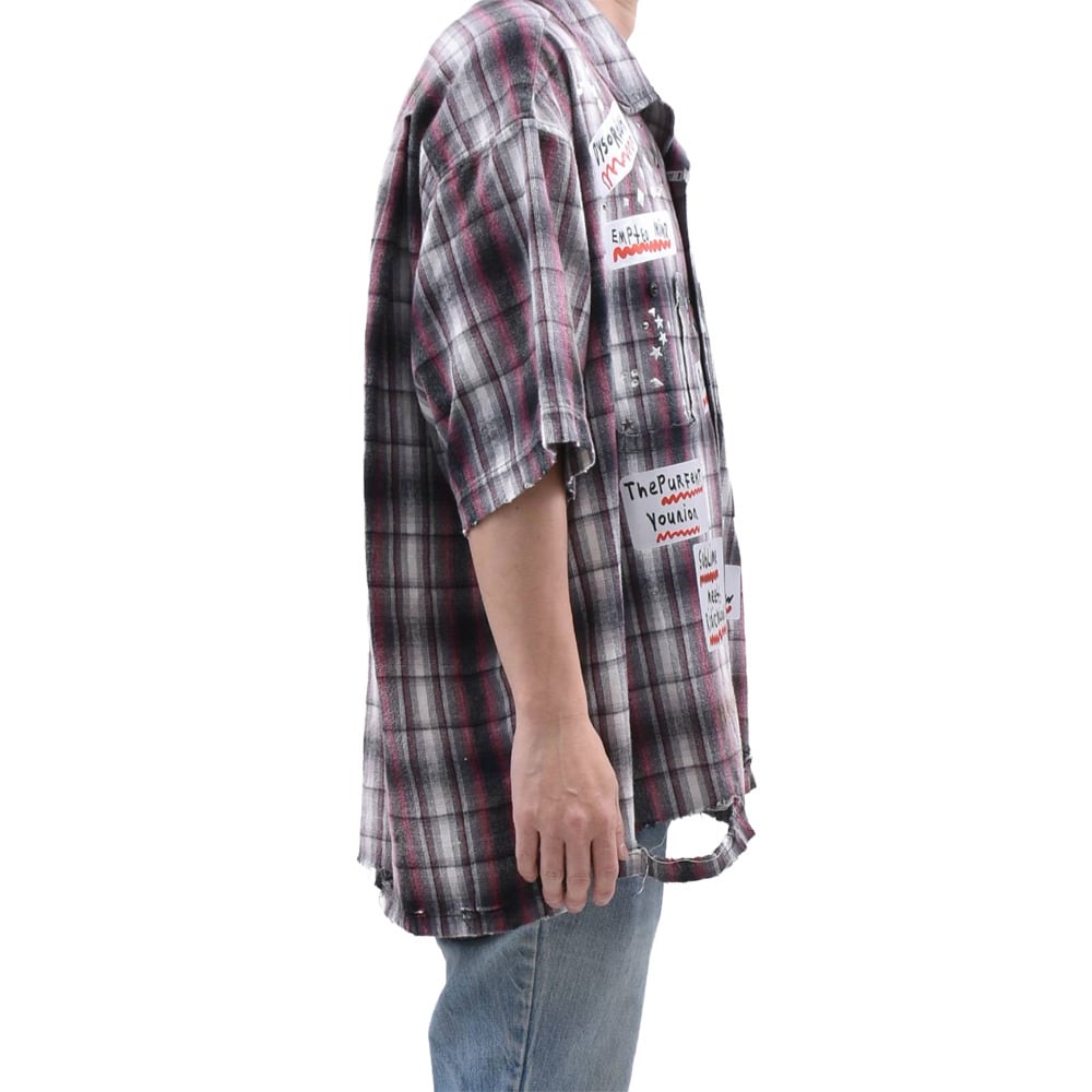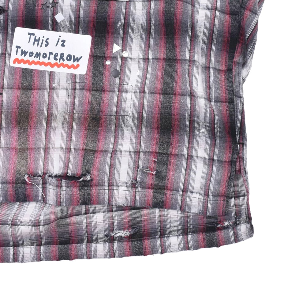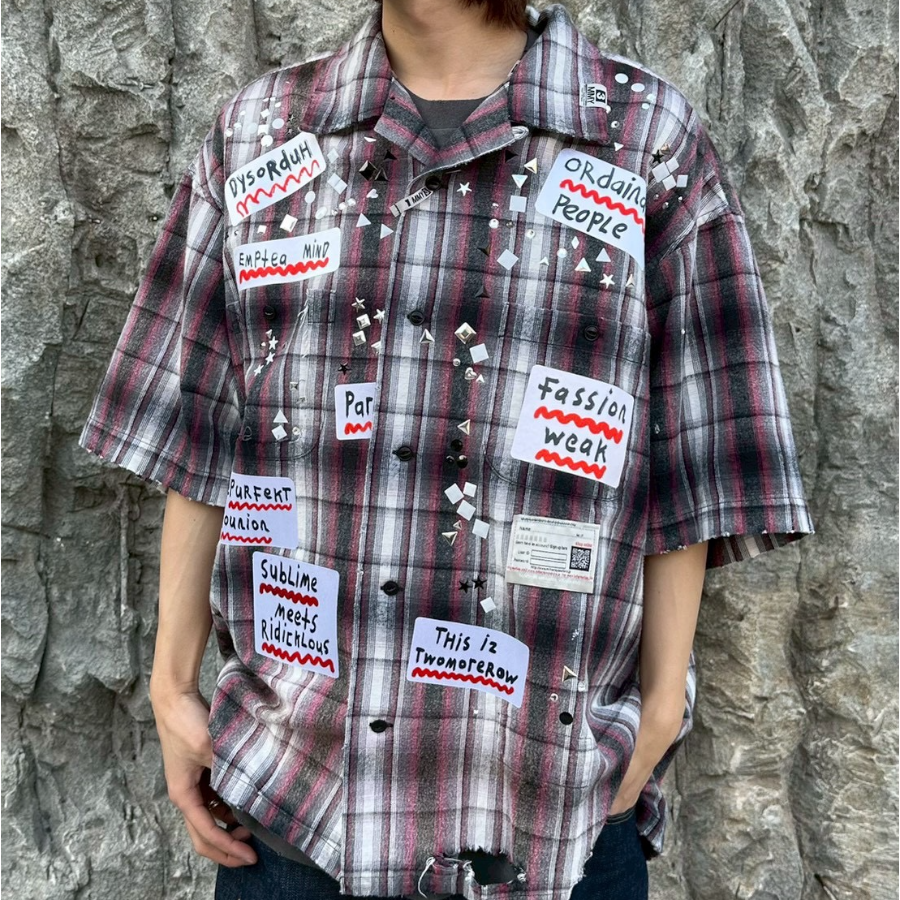 クラシックなオンブレチェックシャツをベースに、パンキッシュなコラージュと遊び心溢れるディテールを詰め込んだ、主役級の一着です。