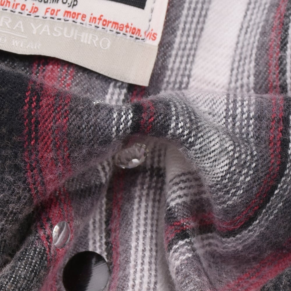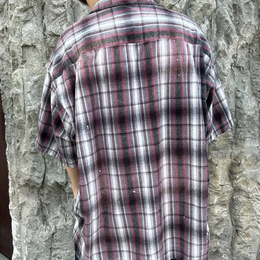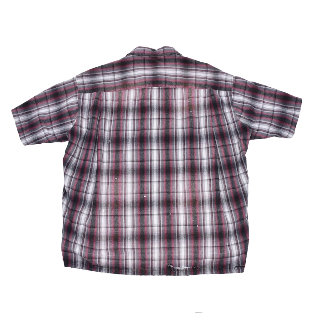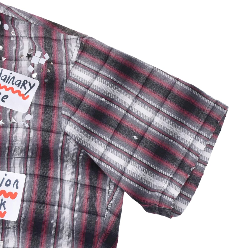 クラシックなオンブレチェックシャツをベースに、パンキッシュなコラージュと遊び心溢れるディテールを詰め込んだ、主役級の一着です。