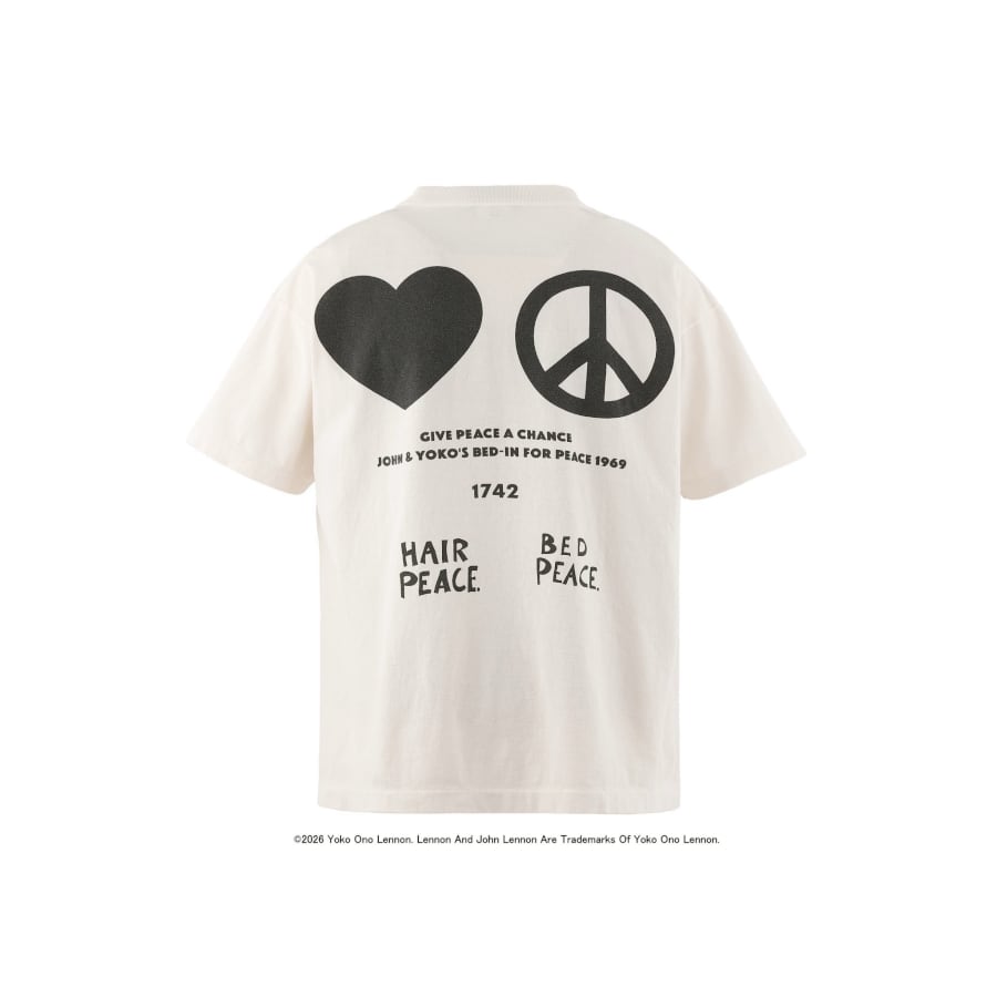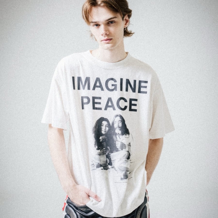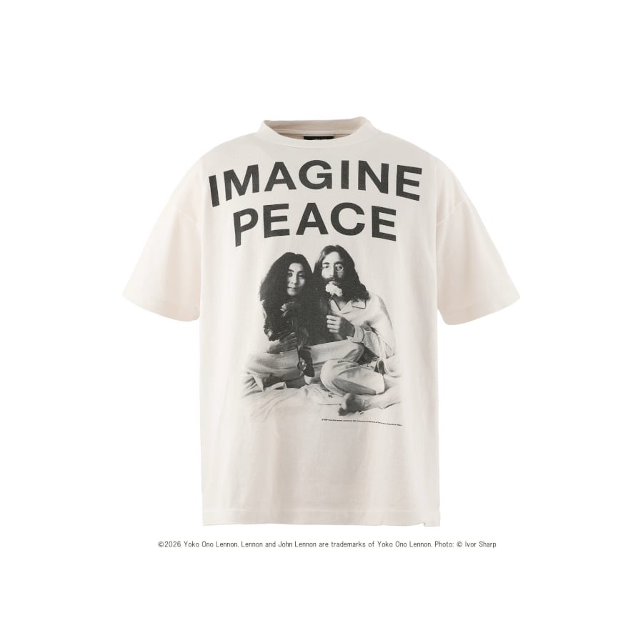 フロントには“IMAGINE PEACE”のメッセージと印象的なフォトを配し、背面にはハートやピースマーク、象徴的なワードを落とし込むことで、John Lennonが残した思想や空気感を一枚の中に表現したデザインに仕上げられています。