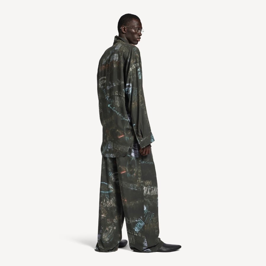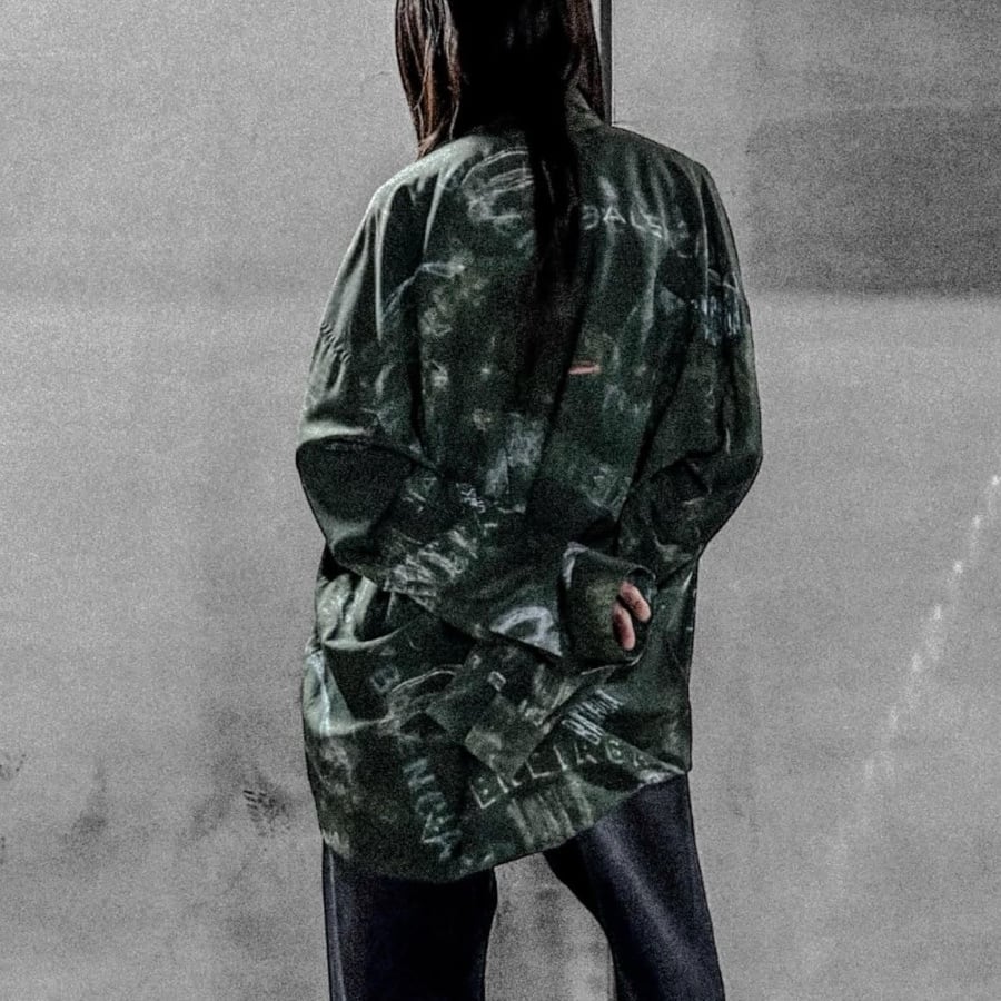 An oversized silk shirt that encapsulates Balenciaga's iconic design codes. The entire shirt features a "scribble graphic" that looks like the brand name has been scribbled in chalk, creating a punky yet luxurious feel.