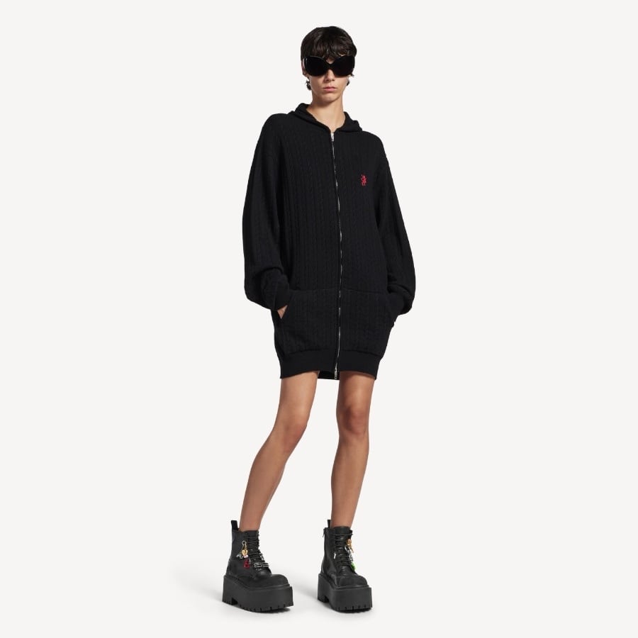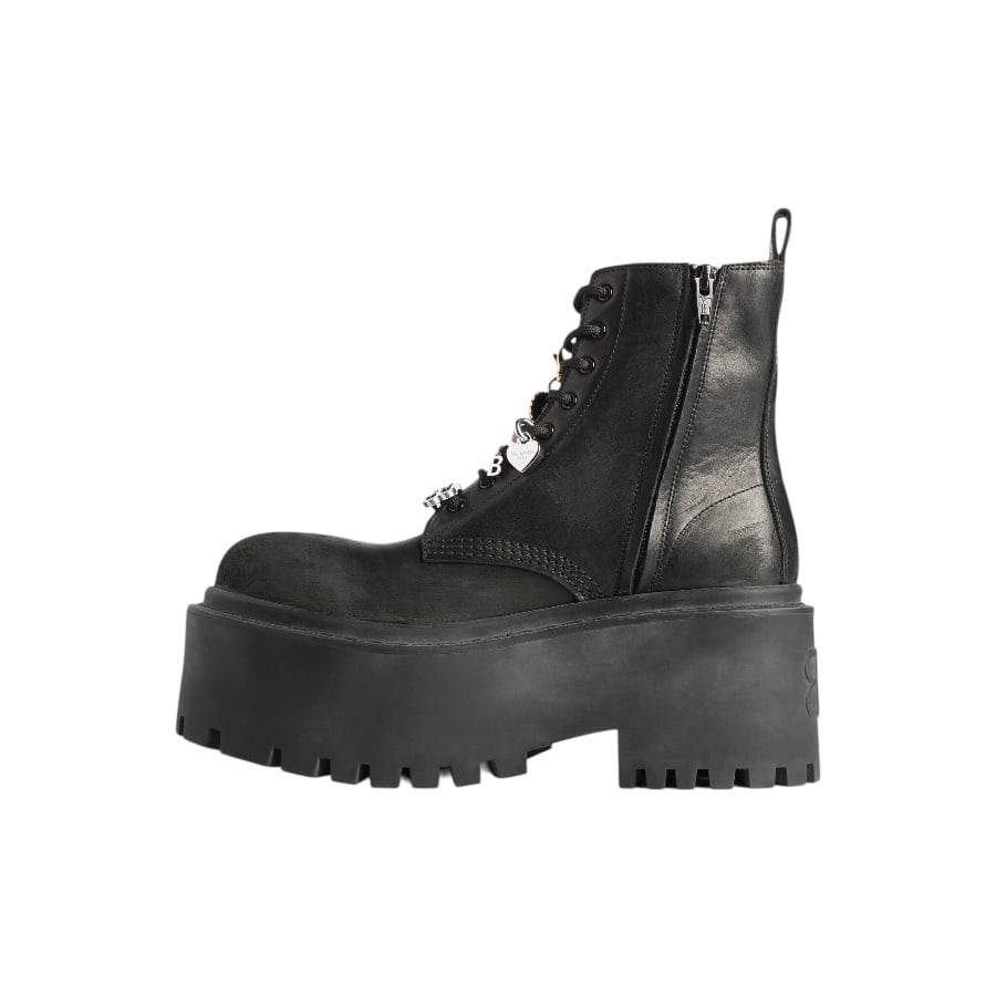 Particularly noteworthy are the multi-charms luxuriously adorning the shoelaces. A variety of motifs, such as the Eiffel Tower, keys, and logo plates, evoking travel and everyday life, add a catchy accent to these rugged combat boots.