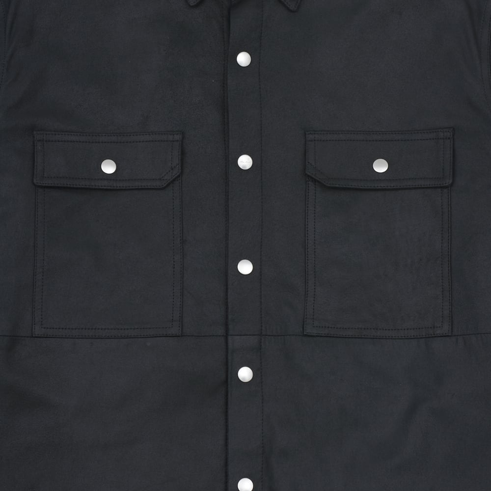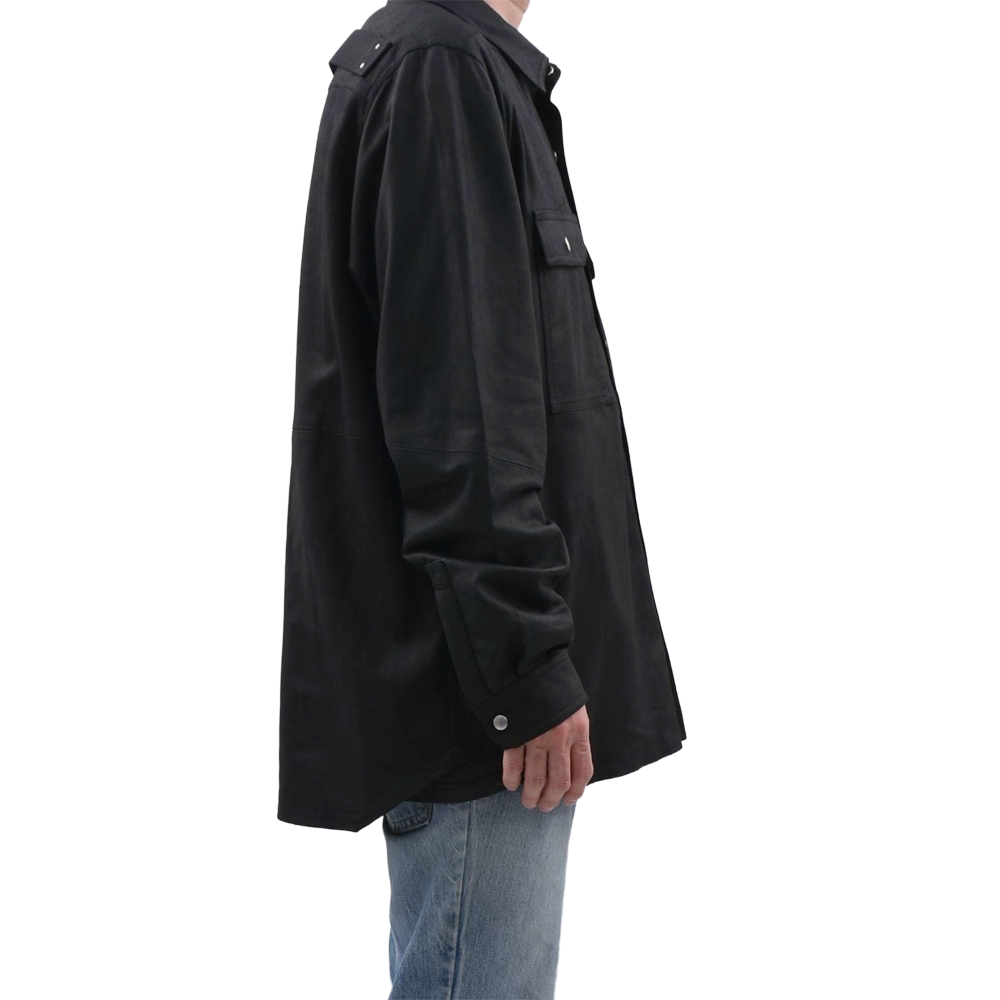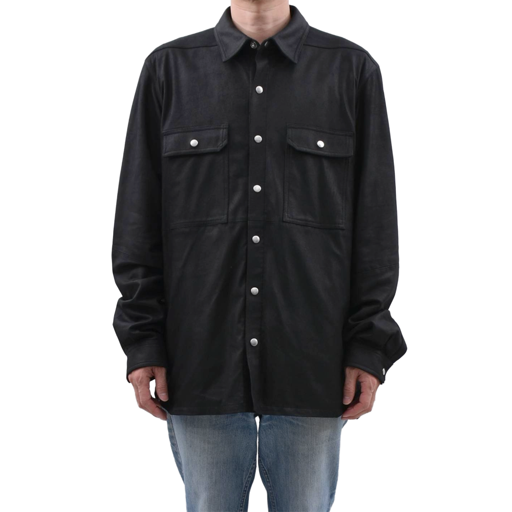 This shirt jacket embodies Rick Owens' signature minimalist and rugged aesthetic.
