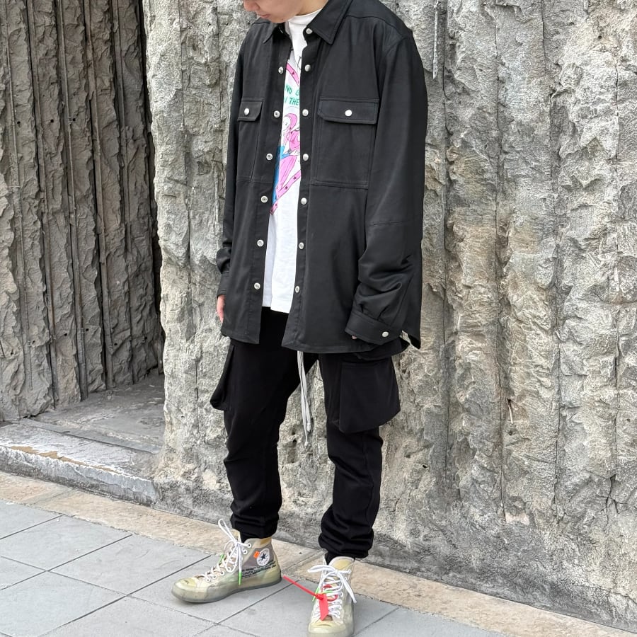 Rick Owensらしい、ミニマルで無骨な美しさが際立つシャツジャケット。