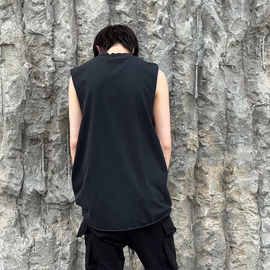 VETEMENTSのアイコニックなデザインコードである「クロス」を、フロント中央にミニマルに配置したノースリーブカットソーです。