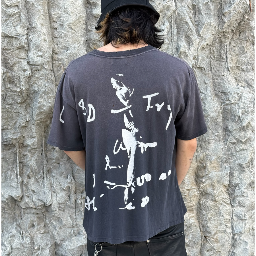 フロントには大胆なフォト×テキストのプリントが施されており、どこか退廃的でカウンターカルチャーなムードを強く感じさせるデザイン。淡いボディカラーとのコントラストが効いていて、一枚でスタイリングの主役になる存在感です。
