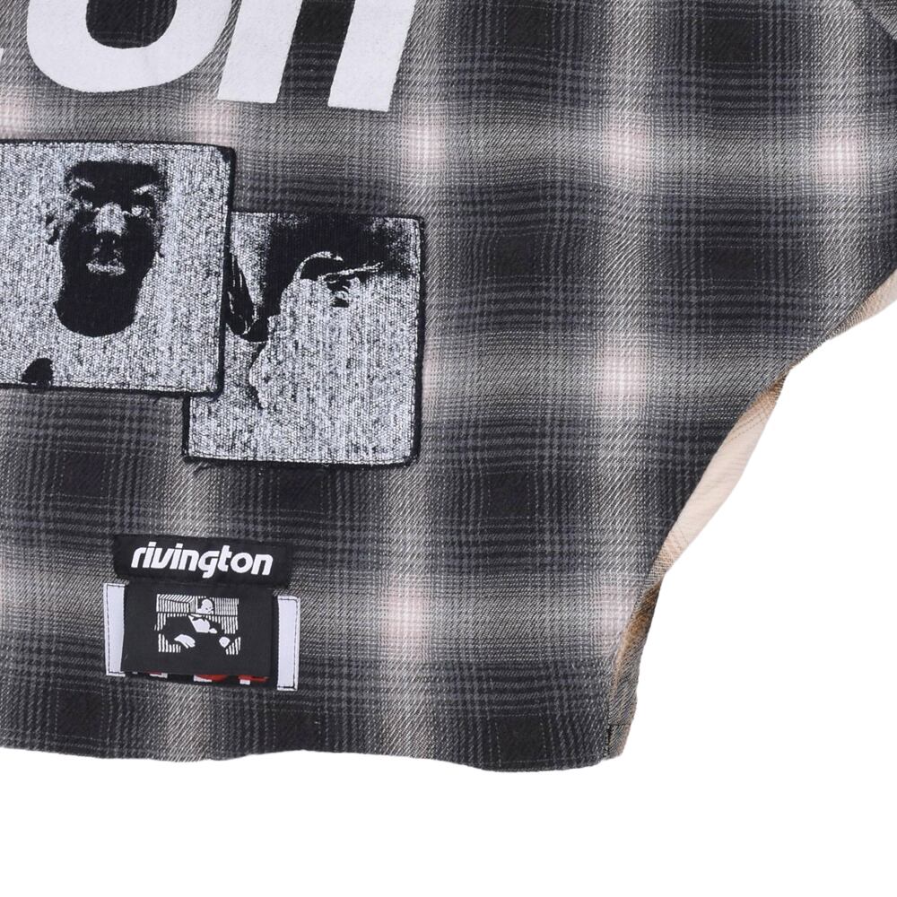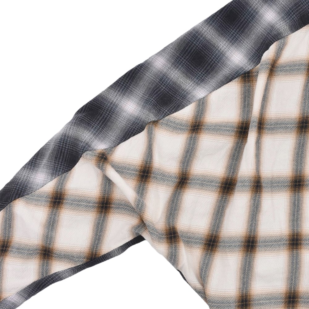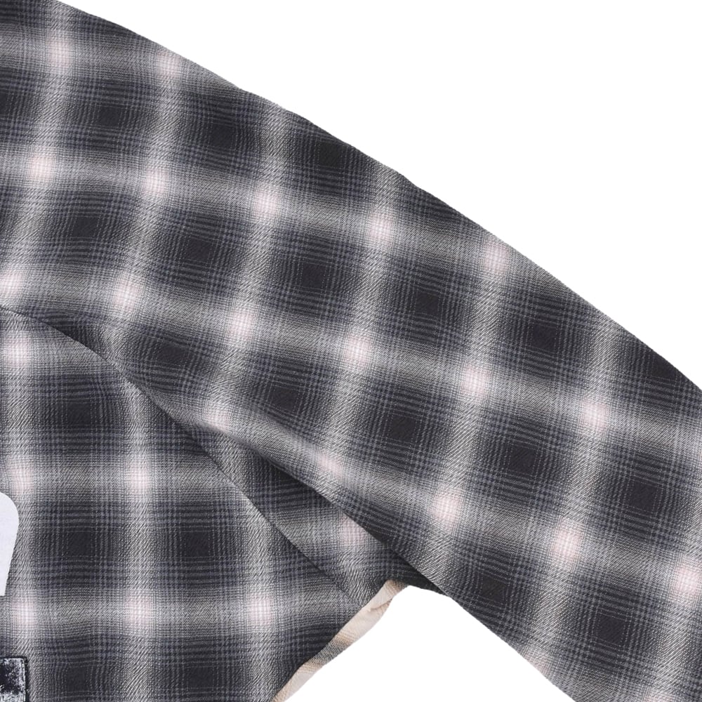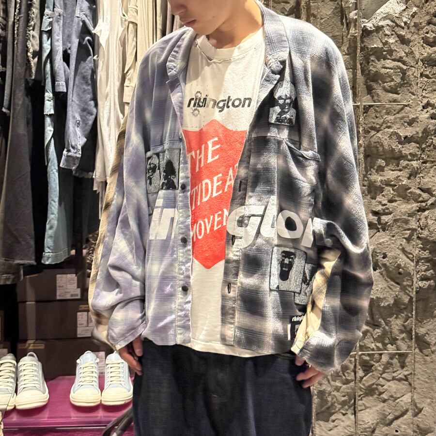 RRR123のチェックシャツは、柔らかな配色と大胆なロゴ使いが目を引く一着。淡いトーンのチェック柄にフロントのグラフィックが重なり、ストリートとカジュアルが絶妙にミックスされたデザインに仕上がっています。