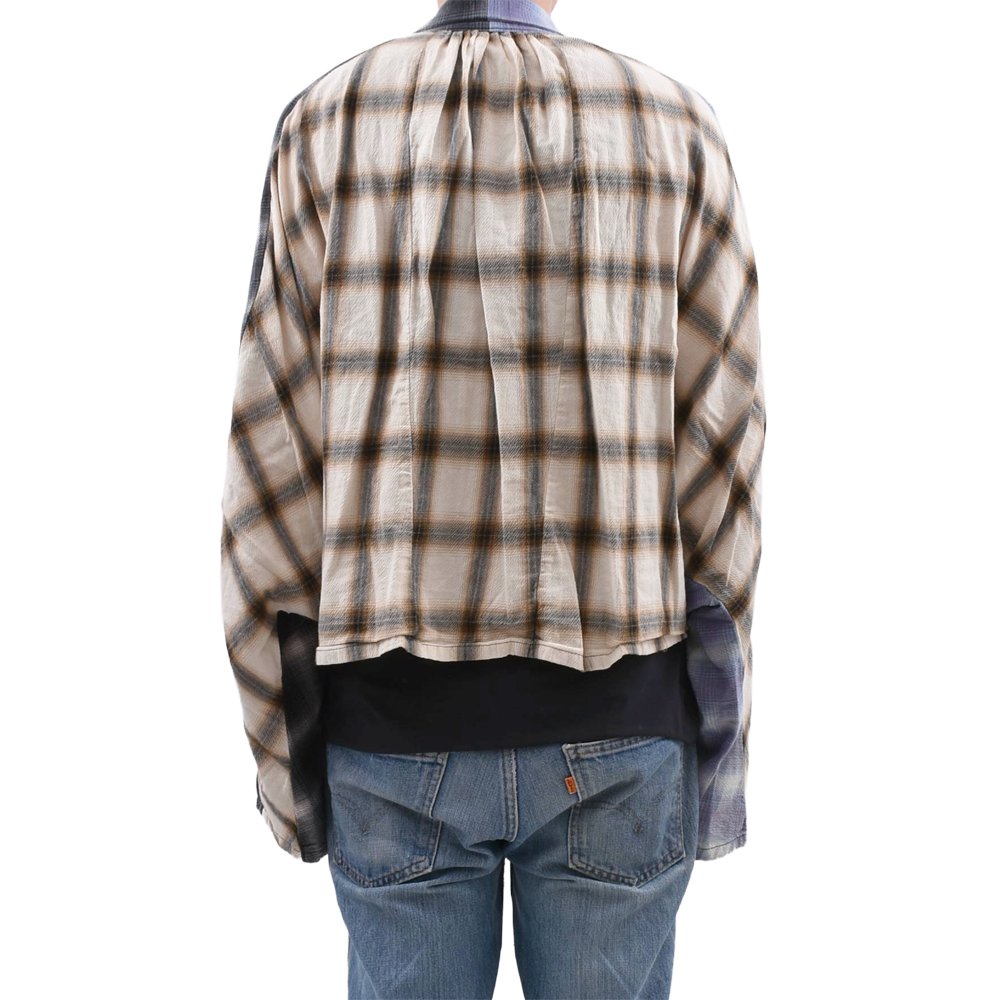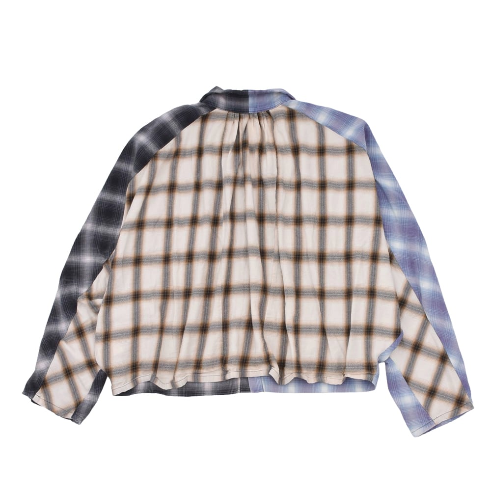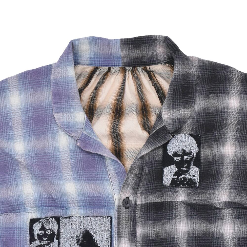 RRR123のチェックシャツは、柔らかな配色と大胆なロゴ使いが目を引く一着。淡いトーンのチェック柄にフロントのグラフィックが重なり、ストリートとカジュアルが絶妙にミックスされたデザインに仕上がっています。