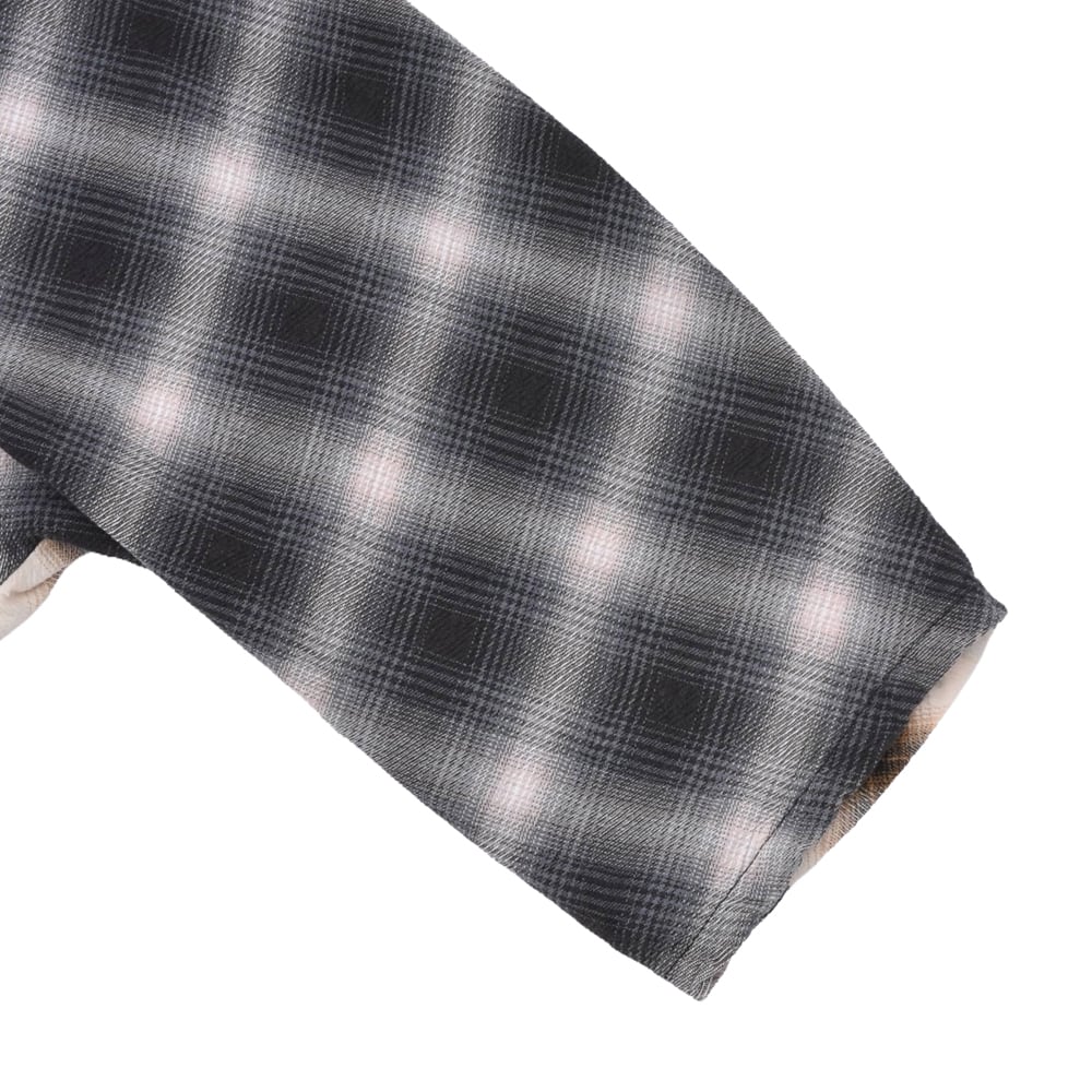 This RRR123 check shirt is eye-catching with its soft color scheme and bold logo. The light-toned check pattern is overlaid with a graphic on the front, resulting in a design that perfectly blends street style and casual wear.