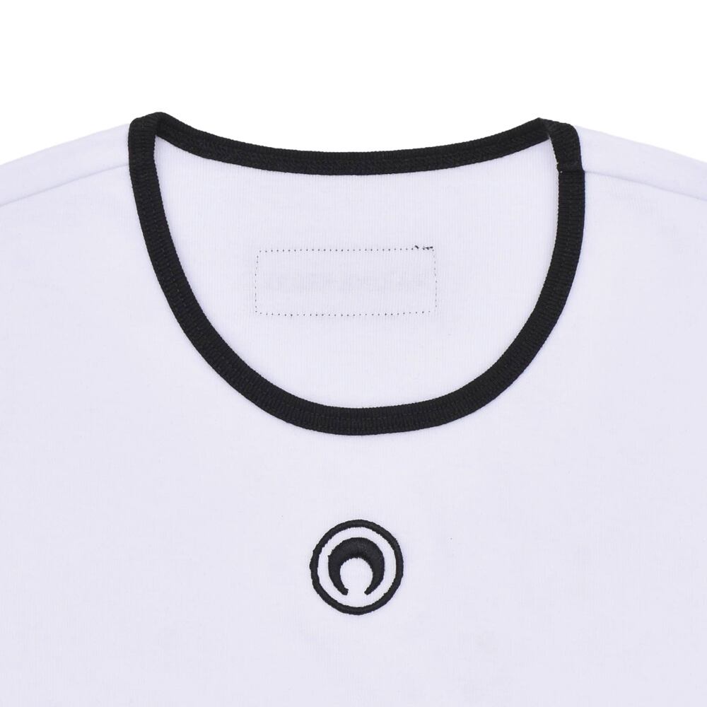 This cropped T-shirt from Marine Serre features a subtly placed logo on the front, creating a striking impression. The compact silhouette, accented by contrasting piping at the neckline and cuffs, results in a simple yet sophisticated design.