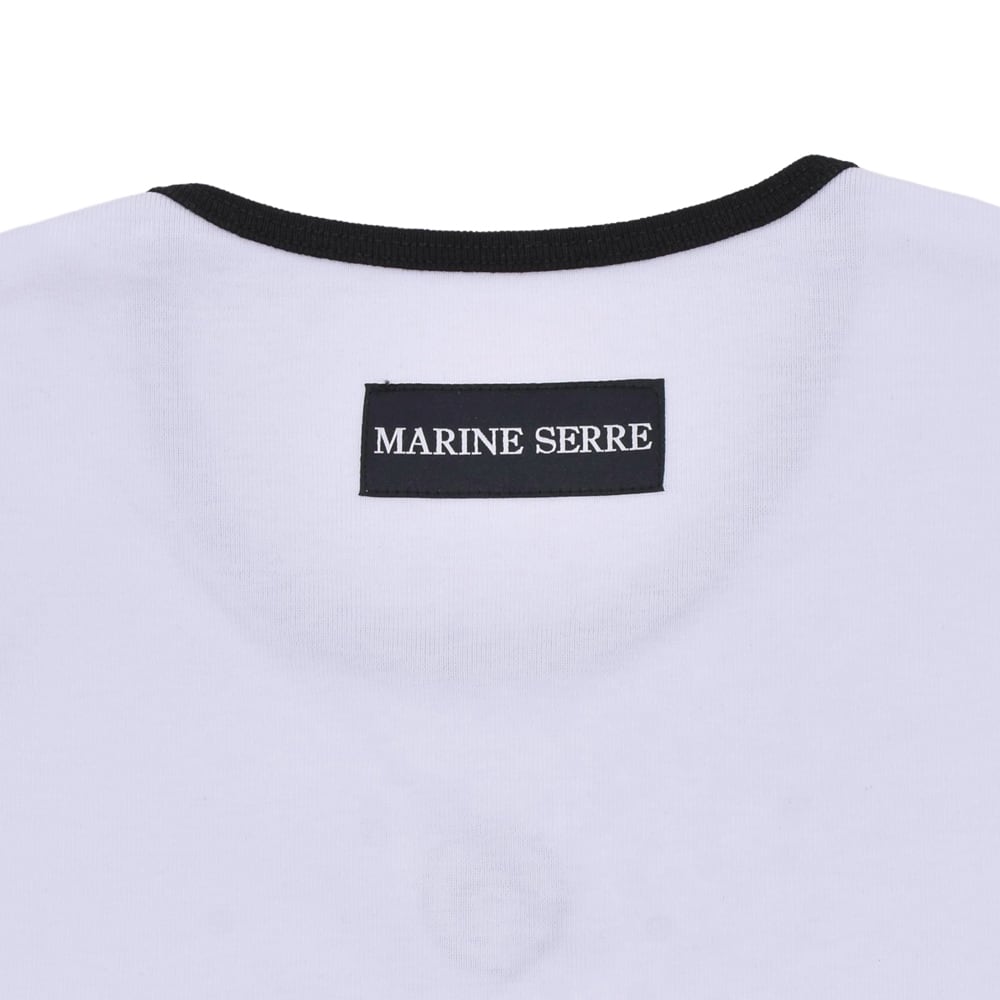 フロントにさりげなく配されたロゴが印象的な、Marine SerreのクロップドTシャツ。コンパクトなシルエットに加え、ネックラインと袖口のコントラストパイピングがアクセントになり、シンプルながらも洗練されたデザインに仕上がっています。