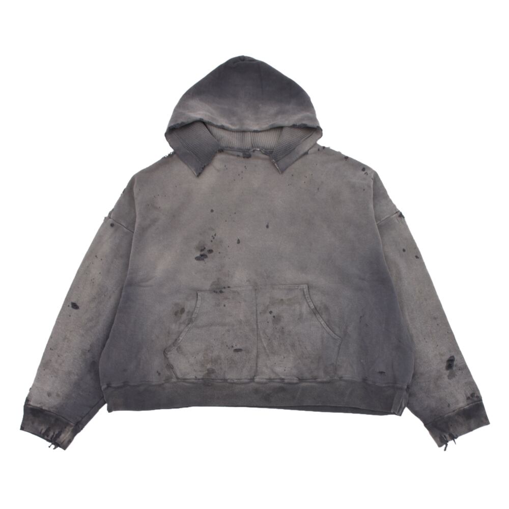こちらの商品はヴィンテージウェアに見られる様な特有の汚れ、アタリ、ダメージなどを加工で表現してデザインとして落とし込んでいるため、